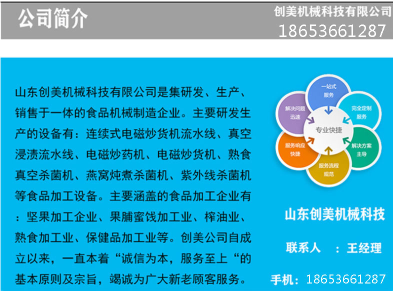 炒貨機(jī)流水線可以根據(jù)客戶(hù)產(chǎn)品數(shù)量的要求來(lái)加工訂做,具體請(qǐng)咨詢(xún)客服